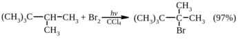 Высокая селективность при бромировании алканов проявляется особенно явно в том случае, когда атом водорода находится при третичном атоме углерода. Так, например, 2,2,3-триметилбутан при бромировании дает более 97% третичного алкилгалогенида, несмотря на то, что на один атом водорода при третичном углероде приходится пятнадцать атомов водорода при первичных атомах углерода: