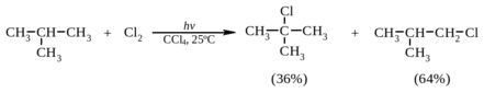 В тех же условиях 2-метилпропан образует 36% 2-хлор-2-метилпропана (трет-бутилхлорида) и 64% 1-хлор-2-метилпропана: