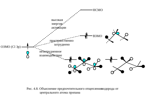 В пропане (и других линейных алканах) ВЗМО находится в основном на атомах углерода (рис. 4.8) и подход к этой ВЗМО типа σС-С пространственно затруднен (иначе бы при хлорировании разрывались связи C – C).