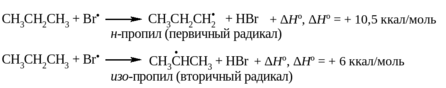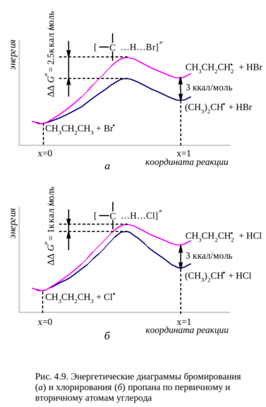 В эндотермичном бромировании, где переходное состояние подобно радикальному продукту, разница в энергиях активации бромирования пропана в положения 1 и 2 составляет 2,5 ккал/моль, что соответствует различию в энергии между пропильным и изопропильным радикалами, равному 3 ккал/моль. В экзотермичном хлорировании разница в энергиях активации составляет величину лишь около 1 ккал/моль, которая сильно отличается от разницы в энергиях первичного и вторичного радикалов. таким образом, постулат Хэммонда на качественном уровне правильно предсказывает более высокую селективность менее активного реагента в эндотермическом процессе.