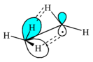 Изменение в стабильности алкильных радикалов обычно связывают с совместным действием двух эффектов – гиперконъюгации и стерического. Гиперконъюгация как внутримолекулярное возмущение подробно описана в главе 2 на примере этильного катиона. Совершенно аналогично можно рассматривать стабилизацию радикального центра соседними метильными группами; например, бóльшая стабильность этильного радикала по сравнению в метильным обусловлена взаимодействием групповой орбитали Ψ двух связей C – H c 2pz-орбиталью, несущей неспаренный электрон. Гиперконъюгацию в радикале можно считать внутримолекулярным взаимодействием ОЗМО радикального центра с ВЗМО заместителей у радикального центра, которое приводит к делокализации неспаренного электрона.