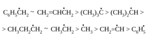 При сравнении энергий первичной и вторичной связей C – H в пропане видно, что они отличаются на 3 ккал/моль. Поскольку исходное соединение и один из радикалов H• одни и те же, эта разница отражает только различие в стабильности первичного и вторичного радикалов. Подобное же различие в энергии диссоциации изобутана (CH3)3CH на (CH3)2CH-CH2• и H• (98 ккал/моль) и его же диссоциации на (CH3)3C• и H• (92 ккал/моль) отражает различие в стабильности первичного и третичного радикалов. На основании этих данных можно составить ряд относительной стабильности алкильных радикалов: третичный > вторичный > первичный. Еще более высокой стабильностью обладают аллильный и бензильный радикалы, тогда как фенильный и винильный радикалы менее стабильны, чем метил-радикал: