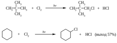 Селективность свободнорадикального хлорирования алканов в целом невысока, и этот метод чрезвычайно редко применяется в лабораторных условиях для получения индивидуальных алкилгалогенидов, но он применяется в промышленности для получения смеси алкилгалогенидов, а из них – смеси спиртов. Исключение составляет хлорирование углеводородов, при котором невозможно образование изомерных продуктов, например: