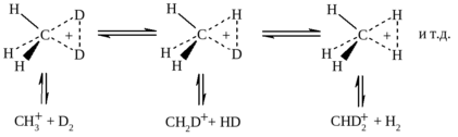 Расстояние H – H, согласно расчетам, почти в точности равно межпротонному расстоянию в молекуле водорода. Отсюда следует, что катион CH5+ можно рассматривать и как комплекс кислоты CH3+ и σ-основания H2. Этим объясняется факт легкого расщепления CH5+ на CH3+ и H2. Вследствие указанного строения в ионе метония возможны перегруппировки «от связи к связи», которые обнаруживаются, например, при применении дейтериевой метки: