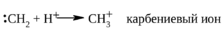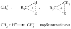и другие, где E = D, H, R, NO2, Hal – это частицы «неклассической» структуры, а трехкоодинированные частицы R3C+ – это классические ионы, в которых связь между каждой парой соседних атомов осуществляется парой электронов. Катионы первого типа называются карбониевыми ионами, а катионы второго типа – карбениевыми ионами, так как формально их можно рассматривать как протонированные карбены: