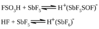 Хотя наиболее характерной для алканов химической реакцией является отрыв атома водорода связи C – H под действием радикальных агентов, в определенных условиях могут проходить реакции и с электронодефицитными, т.е. электрофильными реагентами, например, с протоном, карбокатионами, содержащими трехвалентный углерод (простейший пример – ион CH3+), ионом нитрония (NO2+) и т.п. В этих реакциях затрагиваются на только C – H-связи алканов, как в радикальных процессах, но и связи C – C между атомами углерода. Реакции алканов с протоном наблюдаются в суперкислых средах (гл. 3, разд. 3.3.4), из которых чаще всего используют фторсульфоновую кислоту FSO3H или безводную фтористоводородную кислоту в смеси с кислотой Льюиса SbF5. В результате равновесных реакций возникают комплексные кислоты (в правой части приведенных уравнений), обладающие огромной протонирующей способностью: