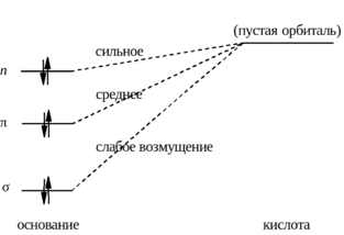 Как правило, основность убывает в ряду: n-основания > π-основания > σ-основания. Это связано с рядом причин. Во-первых, n-орбитали (неподеленные пары) пространственно более доступны для взаимодействия с пустой орбиталью кислоты, чем π- и особенно σ-орбитали. Во-вторых, n-орбитали лежат выше π-орбиталей, и особенно σ-орбиталей, и поэтому возмущение, приводящее к образованию ковалентной связи при кислотно-основном взаимодействии, должно быть больше для n-орбиталей: