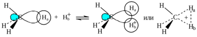 Ион метония CH5+, который экспериментально наблюдался в масс-спектрах, имеет малосимметричное строение, так как при протонировании метана в реакции участвует главная доля гибридизованной sp3-орбитали (фронтальная атака). Электрофил Hb+ атакует места с повышенной электронной плотностью, т.е. между атомами C и H, а не по задней доле орбитали, играющей относительно малую роль: