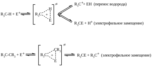 К электрофильным реакциям алканов относятся катализируемые кислотами реакции изомеризации углеводородов, фрагментации, циклизации, а также электрофильное нитрование, галогенирование и некоторые другие реакции. В основе реакционной способности связей C – H или C – C в таких реакциях лежит их способность организовывать пентакоординированные карбониевые ионы. Последующее расщепление трехцентровой связи ведет к образованию трехвалентных карбокатионов (ионов карбения) и продуктов замещения (а также продуктов переноса водорода):