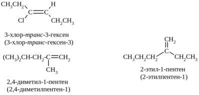 В систематической номенклатуре ИЮПАК названия всех алкенов производятся от названия алканов заменой окончания «-ан» на «-ен». Положение двойной связи в углеродной цепи определяется цифрой и выносится в начало или в конец названия. Начало нумерации цепи определяется наиболее близким положением двойной связи и никоим образом не связано с положением и числом алкильных заместителей в главной цепи. Главная цепь обязана включать двойную связь. Префиксы цис- и транс- выносятся в начало названия: