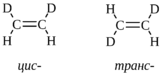 Эти два пространственных изомера превращаются друг в друга при температуре порядка 450 – 500ºС, что соответствует энергии активации взаимопревращения цис↔транс порядка 65 ккал/моль. Переходное состояние этой реакции изомеризации имеет скрученную структуру, в которой p-орбитали обоих атомов углерода взаимно перпендикулярны.