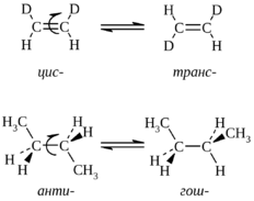 Однако барьер вращения вокруг двойной связи в дидейтероэтилене составляет 65 ккал/моль, тогда как энергетический барьер интерконверсии анти- и гош-форм бутана составляет всего около 4 ккал/моль. Поэтому оба стереоизомера дидейтероэтилена совершенно стабильны даже при 100ºС, в то время, как анти- и гош-формы бутана перестают превращаться друг в друга только при –230ºС. Это различие в интерконверсии обусловлено различными видом стереоизомерии и имеет поэтому различные обозначения. Анти- и гош-формы бутана называются конформационными изомерами, а два изомерных дидейтероэтилена называют конфигурационными изомерами.