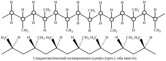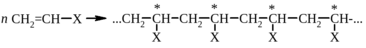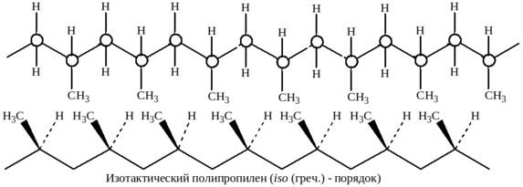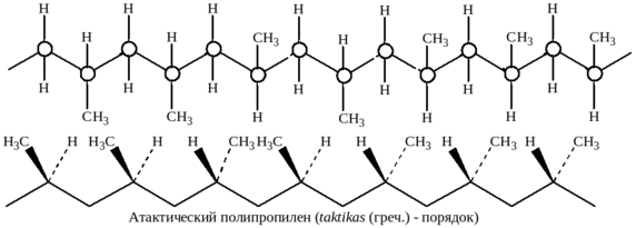 Полимеризация пропилена и других алкенов общей формулы CH2=CHX (X=R; Cl; CN; COOR и др.) по типу «голова к хвосту» приводит к образованию полимера, в котором каждый четный атом углерода главной цепи оказывается хиральным: