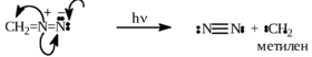 Метилен :CH2 при фотолизе диазометана образуется в менее стабильной синглетной форме. Синглетный метилен в результате столкновений с молекулами диазометана теряет энергию и превращается в более стабильный триплетный метилен. Фотолиз диазосоединений удобен для генерации самого метилена, но малоупотребим для генерации других карбенов вследствие малой доступности выших диазоалканов. Разновидностью этого способа генерации карбенов является каталитическое разложение диазосоединений и в первую очередь диазоуксусного эфира в присутствии меди, ее солей, а также ионов других переходных металлов. Некоторые примеры такого способа генерирования карбенов будут приведены далее.