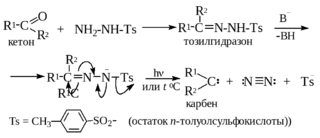 Более общий метод генерирования моно- и диалкилкарбенов заключается в термическом или фотохимическом разложении тозилгидразонов – производных карбонильных соединений. Этот метод, в принципе, является модификацией метода разложения диазосоединений, поскольку и в этом случае интермедиатами являются диазосоединения. Исходные тозилгидразоны образуются при взаимодействии альдегида или кетона с тозилгидразином. Фотохимическое разложение тозилгидразонов в присутствии сильного основания (трет-бутилата калия, н-бутиллития и др.) позволяет избежать выделения диазоалкана. Образующееся диазосоединение сразу же подвергается фотохимическому разложению и не накапливается в реакционной среде. Разложение тозилгидразонов с целью генерации карбенов всегда проводят в апротонной индифферентной среде – диметоксиэтане CH3OCH2CH2OCH3 (моноглим) или диметиловом эфире диэтиленгликоля CH3OCH2CH2-CH2CH2OCH3 (диглим):