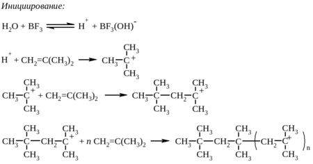Многие алкены полимеризуются в присутствии сильных кислот. В этом случае рост цепи обусловлен присоединением алкенов к карбокатиону, образующемуся в результате электрофильного присоединения инициатора по двойной связи. Такой тип полимеризации носит название катионной полимеризации. По катионному механизму полимеризуются такие алкены, из которых образуются сравнительно устойчивые карбокатионы. К ним следует отнести изобутилен, виниловые эфиры CH2=CH-OR, 3-метилбутен-1 и некоторые производные стирола. Катализатором катионной полимеризации служат кислоты Льюиса: BF3, AlCl3, AlBr3 и другие в присутствии очень малых количеств воды. В качестве иллюстрации приведем катионную полимеризацию изобутилена, катализируемую трехфтористым бором:
