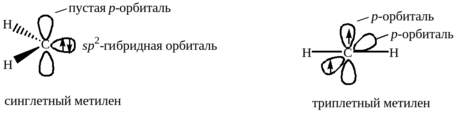 Незамещенный карбен :CH2, называемый также метиленом, может находиться в синглетной и триплетной форме. В синглетной форме карбена два несвязывающих электрона находятся со спаренными спинами на одной орбитали, в то время как в триплетной форме два неспаренных электрона с параллельными спинами находятся на двух орбиталях одинаковой энергии. Синглетный карбен диамагнитен, а триплетный – парамагнитен, поэтому структура триплетного карбена может быть изучена с помощью ЭПР-спектроскопии. Различные электронные конфигурации синглетных и триплетных карбенов находят отражение как в различной геометрии этих частиц, так и в различной химической активности. Двухвалентный атом углерода синглетного карбена находится в sp2-гибридном состоянии, оба электрона расположены на sp2-гибридной орбитали (ВЗМО), а p-орбиталь (НСМО) свободна. Триплетный карбен характеризуется sp-гибридизацией двухвалентного углерода, при этом два неспаренных электрона располагаются на двух p-орбиталях. Угол H – C – H для синглетного метилена согласно спектральным данным, равен 102º, а для триплетного метилена он увеличивается до 135 – 140º. Это соответствует более высокой стабильности триплетного метилена. Согласно данным квантовомеханических расчетов, триплетный метилен действительно на 10 ккал/моль стабильнее синглетного метилена: