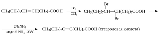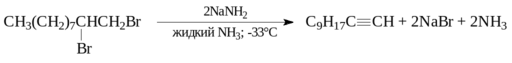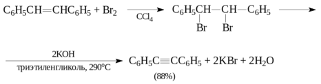 Отщепление двух молекул галогеноводорода от вицинальных дигалогенидов представляет собой один из самых распространенных методов создания тройной углерод-углеродной связи. Поскольку исходные вицинальные дигалогениды получают присоединением брома или хлора к алкенам, весь процесс галогенирования-дегалогенирования является двухстадийным методом превращения алкенов в алкины. Отщепление галогеноводорода достигается с помощью сильных оснований, таких, как КОН в этаноле, КОН в диэтиленгликоле или триэтиленгликоле. Для отщепления последовательно двух молекул галогеноводорода требуются очень жесткие условия, и для сокращения времени реакции нередко используют раствор КОН в диэтиленгликоле или триэтиленгликоле при 200-290 С вместо обычного спиртового раствора КОН:
