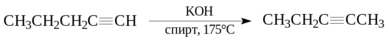 Применение спиртов в качестве растворителя в процессе элиминирования имеет очень важный недостаток при синтезе алкинов со строго определенным положением тройной связи. В спиртовой среде в жестких условиях выше 150 С происходит миграция тройной связи и алкины-1 изомеризуются с перемещением тройной связи внутрь цепи:
