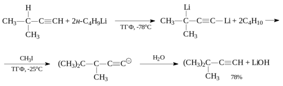 Этот метод не пригоден для введения вторичной или третичной алкильной группы. Для получения алкинов, содержащих вторичную или третичную алкильную группу при тройной связи, в настоящее время разработан эффективный способ, основанный на алкилировании дианионов алкинов с концевой тройной связью. Когда терминальный алкин обрабатывают двумя молями очень сильного основания, такого как н-бутиллитий н-C4H9Li или ди-изо-пропиламд лития LiN(i-C3H7)2, образуется дианион, в котором заряд локализован на ацетиленовом и так называемом пропаргильном атоме углерода, находящемся рядом с тройной связью. Например, при взаимодействии 3-метилбутина-1 с двумя эквивалентами н-бутиллития в ТГФ получается дианион: