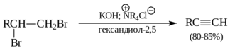 Для синтеза алкинов-1 наиболее эффективна другая модификация дегидрогалогенирования 1,2-дигалогеналканов с использованием КОН в гександиоле-2,5 в присутствии межфазного катализатора: