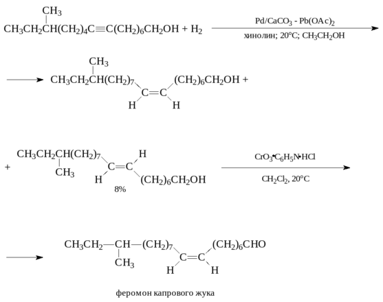 Тем не менее, можно подобрать условия таким образом, чтобы остановить гидрирование на первой стадии. Катализатором восстановления алкинов до алкенов служит палладий на карбонате кальция, дезактивированный обработкой ацетатом свинца (катализатор Линдлара), или другая его разновидность – палладий на сульфате бария, дезактивированный хинолином. Гидрирование алкинов на катализаторе Линдлара происходит стереоселективно с образованием цис-алкенов. Стереохимическая чистота цис-алкенов в этом случае не превышает 96%, т. е. наряду с цис-алкеном всегда получается 5-10% транс-изомера. В качестве наиболее типичного примера приведем гидрирование ацетиленового спирта до цис-алкенола – ключевой стадии в синтезе половых аттрактантов насекомых, например полового феромона капрового жука – 14-метил-8Z-гексадецен-1-аля: