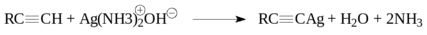 Терминальные алкины образуют серебряные или медные соли при взаимодействии с аммиачным раствором гидроксида серебра или меди (I), которые нерастворимы в воде, спирте и большинстве других растворителей: