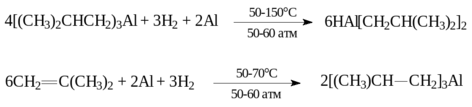 Селективное восстановление тройной связи до двойной объясняется тем, что алкены очень медленно восстанавливаются ДИБАЛ-Н до алканов при 70–80 С, тогда как восстановление алкинов до цис-алкенов осуществляется уже при 0. ДИБАЛ-Н получается в промышленности при взаимодействии очень чистого порошкообразного алюминия, водорода и 3-изобутилалюминия. 3-изобутилалюминий получают из изобутилена и водорода: