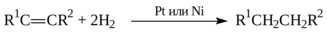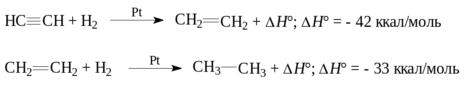 Гидрирование алкинов происходит примерно в тех же условиях и в присутствии тех же катализаторов, что и гидрирование алкенов. Первая стадия гидрирования ацетилена до этилена более экзотермична, чем вторая, где этилен превращается в этан: