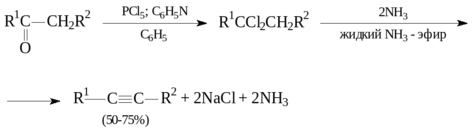 Геминальные дигалогениды получаются с удовлетворительным выходом при действии на кетон пятихлористого фосфора и пиридина в бензоле. Отщепление галогеноводорода достигается действием КОН в диэтиленгликоле, однако наилучшие результаты достигаются при применении амида натрия в смеси жидкого аммиака и эфира: