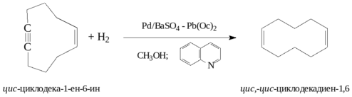 Другим интересным примером избирательного восстановления тройной связи на катализаторе Линдлара является гидрирование цис-циклодека-1-ен-6-ина, где двойная связь не затрагивается: