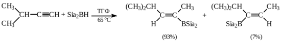 Алкины с неконцевой тройной связью также присоединяют дисиамилборан, пирокатехинборан и другие гидриды бора общей формулы R2BH. Реакция протекает стереоспецифично как син-присоединение. Гидроборирование несимметричных алкинов происходит региоселективно, и группа BR2 присоединяется к менее пространственно затрудненному концу тройной связи: