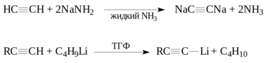 Ацетилен и терминальные алкины обладают свойствами слабых С-Н кислот с pKa 25 (гл. 3). Они образуют соли при взаимодействии с амидом натрия, н-бутиллитием, диизопропиламидом лития и другими сильными основаниями, pKa сопряженных кислот которых выше тридцати: