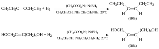 Для получения из алкина олефина цис-конфигурации 98–99% стереохимической чистоты в качестве катализатора гетерогенного гидрирования следует использовать коллоидальный никель (коммерческое название Р-2-Ni). Такой катализатор получается в результате восстановления ацетата никеля в спирте в присутствии 1,2-этилендиамина H2NCH2CH2NH2, который препятствует дальнейшему гидроборованию алкена до алкана: