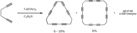 Для окисления ацетиленидов меди (I) в качестве окислителя более эффективен гексацианоферрат (III) калия K3[Fe(CN)6] в ДМЭ или ДМФА. В 1959 г. Эглинтон предложил значительно более удобную модификацию окислительной конденсации алкинов. Алкин окисляют ацетатом меди (II) в растворе пиридина при 60–70 С. Модификация Эглинтона оказалась чрезвычайно полезной для синтеза макроцикличеких полиинов из ,-диинов. В качестве иллюстрации приведем синтез двух циклополиинов при окислительной конденсации гексадиина-1,5 (Ф. Зондхеймер, 1960):