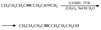 Двухстадийный процесс гидроборирования алкинов с последующим окислением перекисью водорода с точки зрения конечного результата эквивалентен присоединению воды по тройной связи. Для алкинов с концевой тройной связью он приводит к образованию альдегида, что соответствует анти-марковниковской региоселективности гидратации двойной связи. Для сравнения отметим, что кислотно-катализируемая прямая гидратация алкинов протекает в полном соответствии с правилом Марковникова и приводит к образованию кетонов (см. гл. 6). 9-Борабицикло(3.3.1)нонан (9-ББН) удивительно инертен по отношению к алкинам, хотя легко присоединяется к алкенам. Это позволяет селективно гидроборировать двойную связь в присутствии тройной связи в енинах: