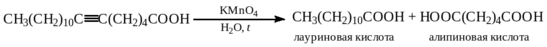 Выход продуктов окислительной деструкции алкинов невелик, и эта реакция не играет заметной роли в органическом синтезе. Она используется исключительно для доказательства строения природной ацетиленовой кислоты, содержащейся в листьях тропических растений в Центральной Америке. При ее окислительной деструкции были выделены две кислоты – лауриновая и адипиновая. Это означает, что исходная кислота представляет собой 6-октадециновую кислоту с нормальным углеродным скелетом из семнадцати атомов углерода: