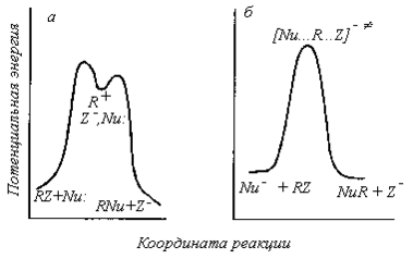 При реализации классического ионизационного механизма SN1 Ингольда—Хьюза определяющей скорость реакции стадией является гетеролитическая диссоциация, ведущая к образованию свободного трехкоординированного карбокатиона и уходящей группы. Далее следует вторая стадия — быстрая рекомбинация электрофильного карбокатиона с любым основанием Льюиса (нуклеофилом), имеющимся в растворе, включая и сам растворитель. Этому процессу соответствует энергетическая диаграмма, представленная на рис. 9.1, а.