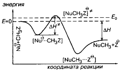 изображена на рис. 9.3. Левый минимум соответствует предреакционному комплексу Nu-...CH3Z, а правый — послереакционному комплексу NuСН3...Z-. Энергия предреакционного комплекса ниже, чем энергия реагентов (Nu- + СН3Z), а энергия послереакционного комплекса ниже энергии продуктов реакции (CH3Nu + Z-). Это связано с тем, что свободные ионы в газовой фазе исключительно нестабильны (гл.3, ч. 1). Связи, обозначенные в комплексах пунктиром, имеют в основном электростатическую природу, при этом во фрагментах СН3Z или NuCH3 связи почти не искажены и имеют в основном ковалентный характер. Превращение предреакционного комплекса в послереакционный происходит через седловую точку на кривой, которой отвечает переходное состояние [Nu ... СНз... Z]- с более или менее симметричной структурой (в зависимости от Nu:- и Z) и делокализованным зарядом. Образование ион-молекулярных комплексов установлено экспериментально. Например, в газовой фазе получены комплексы типа Hal-...СНзНаl, энергия электростатической связи в которых составляет от 8,6 до 14,4 ккал/моль. Эти комплексы в принципе аналогичны комплексам с водородной связью В-....НА, которые образуются при переносе протона между кислотой (НА) и основанием (В-) Бренстеда (гл. 3, ч. I).