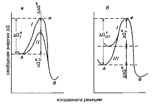 Скорость реакций определяется величиной свободной энергии активации G, которая равна разности свободных энергий исходных реагентов и переходного состояния (гл. 3, ч. 1).