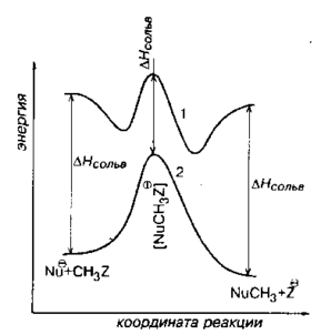 Вторая причина изменения формы кривой состоит в том, что реакции нуклеофила с субстратом в растворе должна предшествовать хотя бы частичная десольватация нуклеофила и субстрата, приводящая к высвобождению некоторого числа молекул растворителя. Допустим, что на первой стадии SN2-реакции вместе с частичной десольватацией происходит образование ион-молекулярного комплекса: