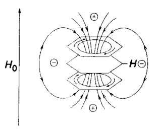 При помещении вещества в однородное магнитное поле с напряженностью H0 в системе электронов индуцируются токи, которые в свою очередь генерируют магнитное поле с напряженностью H1=H0M, где M - магнитная восприимчивость, отнесенная к единице количества вещества. Для диамагнитных веществ, т.е. соединений, не содержащих неспаренных электронов, индуцированное магнитное поле направлено противоположно внешнему, и магнитная восприимчивость M всегда отрицательна. Так как электронная система органических соединений практически никогда не обладает сферической симметрией, индуцированное магнитное поле анизотропно, т.е. изменяет свои характеристики в зависимости от направления в пространстве. Особенно ярко это выражено в ароматических соединениях, где помимо эффекта локальной анизотропии возникает так называемый «кольцевой ток» из-за наличия замкнутой системы электронов.