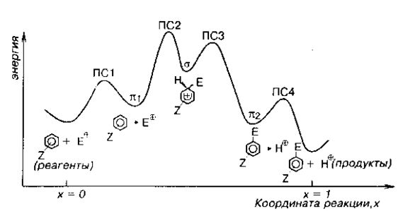 Рис. 13.1. Идеализированная диаграмма для реакций электрофильного ароматического замещения. ПС - переходное состояние