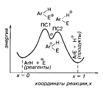 Рис. 13.3. Упрощенная энергетическая диаграмма для электрофильного замещения