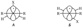 Алкильные радикалы, несущие в β-положении какой-либо заместитель XCH2C•R2, могут существовать в двух предельных конфигурациях: заслоненной (А) и гош-форме (Б):
