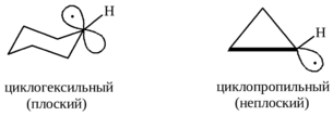 Циклогексильный, циклопентильный и циклобутильный радикалы имеют практически плоский радикальный центр, но циклопропильный радикальный центр неплоский. Последнее доказано спектральными данными, а также тем, что часто оптически активные циклопропильные соединения в радикальных реакциях реагируют с частичным сохранением конфигурации на радикальном центре.