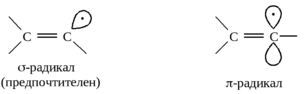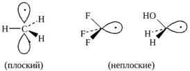 ЭПР-, ИК- и УФ-спектры метильного радикала, полученного при очень низких температурах в аргонной матрице, где он живет достаточно долго, свидетельствуют о его плоском строении (π-радикал). Если в метильном радикале атомы водорода замещаются на группы, несущие неподеленные пары, то радикалы становятся неплоскими (σ-радикалы):