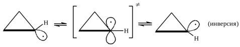 Относительная конфигурационная стабильность циклопропильного радикала объясняется относительно высоким барьером инверсии пирамидальной структуры (как и в циклопропильном анионе, см. гл. 3, ч.1).