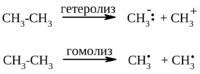 Очевидно, что σ-связь C – C в молекуле этана может быть разорвана двумя способами: гетеролиз ведет к образованию ионов противоположного заряда, а гомолиз – к образованию радикалов:
