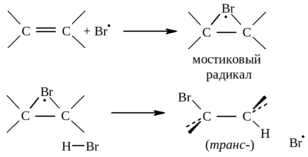 Особое внимание исследователей привлекает строение β-галогеналкильных радикалов. Это связано с тем, что радикальное присоединение HBr и Br2 к алкенам предпочтительно протекает как транс(анти)-присоединение. Для объяснения такого результата предполагается образование мостикового радикала, аналогичного бромониевому иону (гл. 5, ч.1):